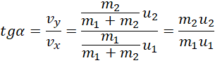 Na podstawie zasady zachowania pędu wyznacz wartość prędkości po zderzeniu, tę samą zasadę wykorzystaj do znalezienia szybkości. Tangens kąta oblicz korzystając ze składowych szybkości kul. Ubytek energii oblicz jako różnicę między energią początkową dwóch kul a energią końcową połączonych kul.