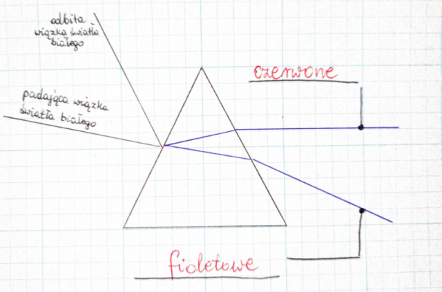 Światło czerwone w świetle białym ma największą długość, więc ono załamie się najmniej.