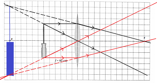 Skoro f wynosi 60 cm, a f to odległość od środka soczewki do ogniska, to znaczy, że ognisko należy narysować w odległości 6 cm od środka soczewki (po uwzględnieniu skali)