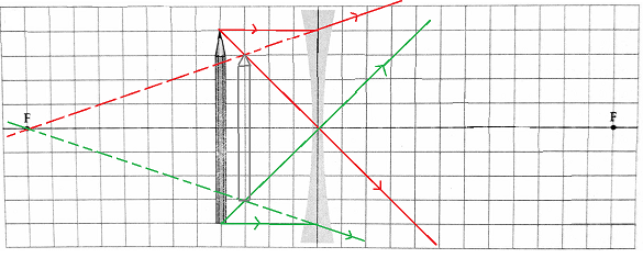 Jeden promień pada równolegle do osi optycznej na soczewkę i odbija, rysujemy przedłużenie odbicia. Drugi promień przechodzi przez środek soczewki i nie załamuje się.