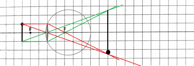 Promień pada na soczewkę równolegle do osi optycznej i przechodzi przez ognisko. Drugi promień pada na środek soczewki i nie ulega załamaniu.
