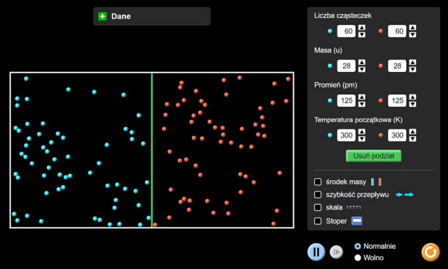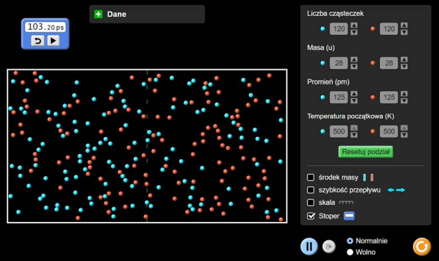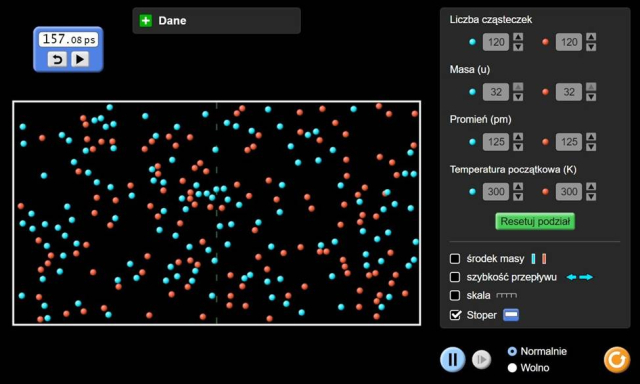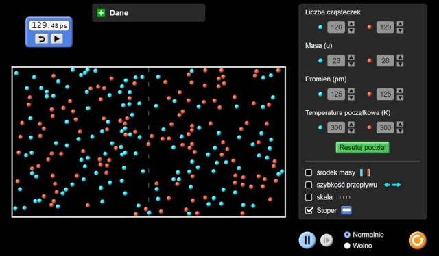 Wejdź we wskazany link i wybierz parametry dotyczące cząsteczek obu substancji – w tym przypadku wybierz wszelkie parametry jednakowe. Im więcej cząsteczek wybierze, tym szybciej zauważysz całkowite wymieszanie się cząsteczek.