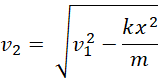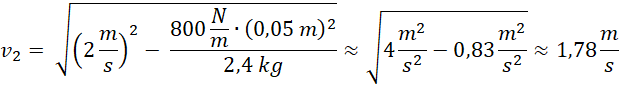 Początkowa energia kinetyczna wózka zmienia się w energię sprężystości przekazaną zderzakowi oraz energię kinetyczną wózka po zderzeniu. Dlatego możemy zapisać taką równość. Następnie rozpisujemy wzór i przekształcamy go w taki sposób, aby otrzymać wzór na prędkość po zderzeniu. Podstaw dane liczbowe i wykonujemy obliczenia.