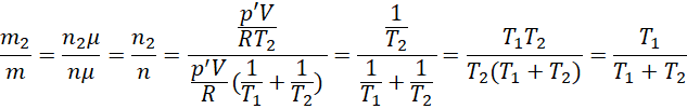 Zapisujemy stosunek masy gazu znajdującego się w pojemniku o wyższej temperaturze do całkowitej masy gazu. Stosujemy zależność masy od ilości moli. Następnie zapisujemy ilość moli korzystając z wyprowadzeń przeprowadzonych w punkcie a) i skracamy odpowiednie wielkości.