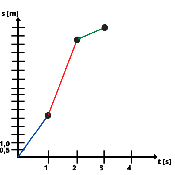 Na wykresie kolorem niebieskim zaznaczona jest droga przebyta z szybkością v1, na czerwono – z szybkością v2, na zielono – z szybkością v3.