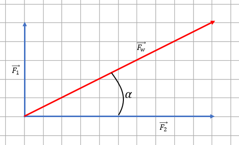 Siła wypadkowa tworzy zawsze kąt z siłami składowymi, stosując zależności trygonometryczne, które poznasz potem będziesz mógł/mogła obliczyć wartość siły wypadkowej lub kąt jaki tworzy ona z jedną z sił składowych. Kąt pomiędzy siłą wypadkową, a najdłuższą siłą składową jest taki sam jak w podpunkcie a), ponieważ proporcje sił prostopadłych są takie same (1:2)