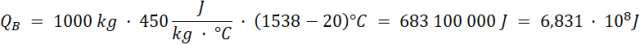 · potrzebną do podgrzania tony żelaza od temperatury 20°C do temperatury topnienia (B)