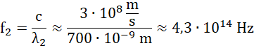 Korzystamy ze wzoru na prędkość fali świetlnej, który przekształcamy tak, aby otrzymać zależność na częstotliwość fali. Podstawiamy dane liczbowe, nie zapominając o odpowiedniej zamianie jednostek.