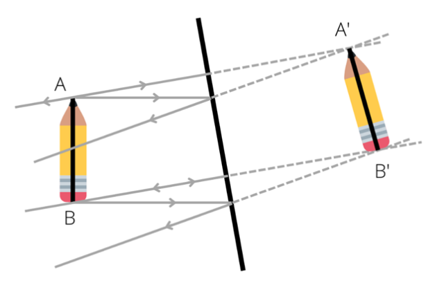 Rysujemy promienie padające i promienie odbite wychodzące z dwóch krańcowych części ołówka i łączymy powstałe punkty, tworząc obraz.