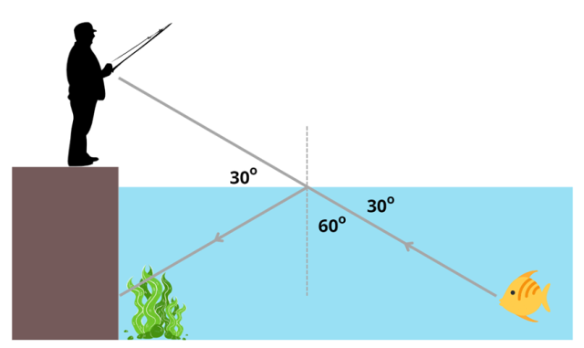 Ryba patrząca wzdłuż odcinka łączącego ją z wędkarzem zobaczy dno zbiornika wodnego, ponieważ kąt padania jest większy od kąta granicznego i zachodzi zjawisko całkowitego wewnętrznego odbicia.