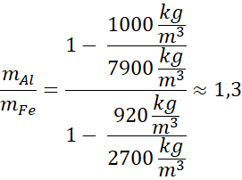 Na początku wypisujemy gęstości cieczy i materiałów wykorzystywanych w zadaniu, które odczytujemy z tabeli znajdującej się na końcu podręcznika. Następnie zapisujemy równość sił wypadkowych znajdujących się po prawej i po lewej stronie pręta. Wzór przekształcamy otrzymując zależność przedstawiającą stosunek mas kulek.