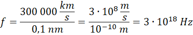 Oblicz częstotliwość fali wytwarzanej przez lampę rentgenowską, jeśli jej długość wynosi ok. 0,1 nm, a fala elektromagnetyczna rozchodzi się z prędkością 300 000 .