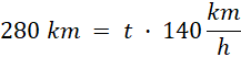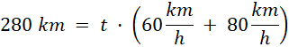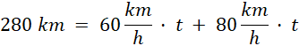 Ponieważ samochody pokonują tę samą drogę, to droga s jest równa 280 km. Prędkość każdego z samochodów jest znana, możesz więc podstawić wartości do powyższego równania, a następnie tak je przekształcić, by móc obliczyć czas t.