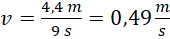 Możemy zauważyć, że między 1 a 10 sekundą ruchu położenie ciała zwiększyło się o 4,4 metra, zatem w ciągu 9 sekund ciało pokonało odległość 4,4 metra, a więc jego prędkość wynosi: