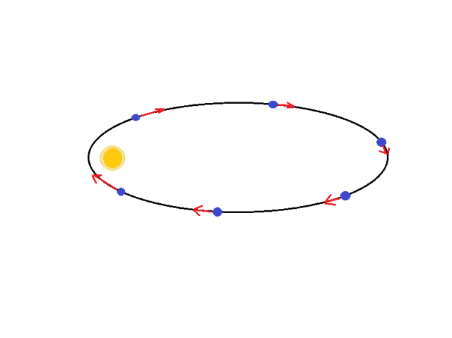 Zgodnie z prawami Keplera kometa będzie poruszać się tym szybciej, im jest bliżej Słońca, a więc wektory prędkości będą odpowiednio dłuższe.