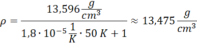 Oblicz gęstość rtęci w temperaturze jeśli gęstość rtęci w temperaturze 0°C wynosi , a współczynnik jej rozszerzalności objętościowej wynosi .