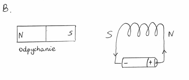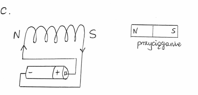 Skoro wiadomo, że na rysunkach A i C magnes i zwojnica się przyciągają, a zmieniliśmy kierunek przepływu prądu, to bieguny będą odwrotne (bo nadal występuje przyciąganie).