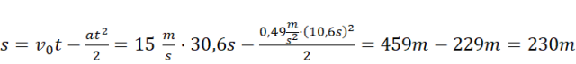 Stosunek siły bezwładności i siły grawitacji działających na uchwyt jest tangensem kąta odchylenia się uchwytu. Wiedząc, że siła to iloczyn masy i przyspieszenia (lub opóźnienia), oblicz wartość przyspieszenia (opóźnienia) tramwaju. Oblicz czas, w jakim będzie hamował. Następnie oblicz drogę korzystając ze wzorów na jej wartość w ruchu jednostajnie zmiennym.