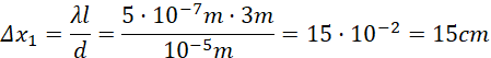 W poprzednim zadaniu obliczyłeś, że dokładna odległość między prążkami piątego i szóstego to około 17 cm. Natomiast przybliżenie, korzystając z powyższych obliczeń, daje:
