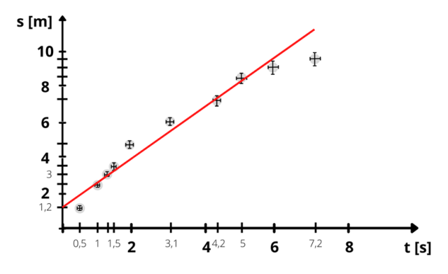 Najpierw zaznaczamy punkty przecięcia. Następnie zaznaczamy krzyże niepewności, np. niepewność 0,1 m oznacza, że zaznaczamy linię odpowiadającą na wykresie długości 0,1 m w górę od punktu i taką samą w dół. Linia najlepszego dopasowania (czerwona) powinna przechodzić przez jak najwięcej punktów pomiarowych.