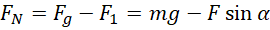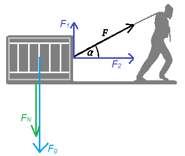 Siła grawitacji jest stała. Siła nacisku to siła grawitacji pomniejszona o prostopadłą składową siły, z którą mężczyzna ciągnie skrzynię.