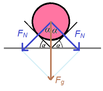 Spójrz na rysunek. Narysuj na nim siły, jakie wywierane są przez kulę na ścianki. Kula ma masę 7,255 kg, a ścianki nachylone są do poziomu pod kątem 45º. Następnie oblicz wartość wyznaczonych sił.