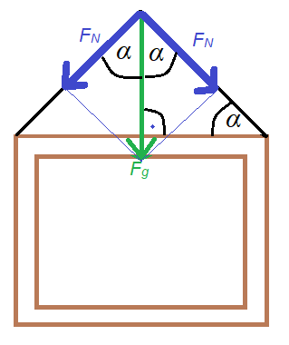 Obraz o ciężarze 400 N wisi na ścianie tak, jak na rysunku. Linka, której użyto, wytrzymuje naprężenie 350 N i tworzy z krawędzią obrazu 45º. Oblicz siłę naprężenia linki.
