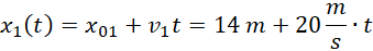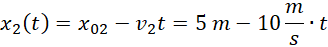 Zapisujemy równania ruchu, wstawiając dane odczytane z rysunków do odpowiedniego wzoru. Prędkość drugiego samochodu jest ujemna, ponieważ porusza się on przeciwnie do osi x.