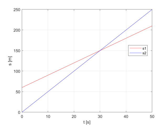 Korzystając ze wzorów wyznaczonych w punkcie a) zapisujemy równania ruchu obu rowerzystów, podając wielkości liczbowe w jednostkach układu SI. Na ich podstawie rysujemy wykresy.