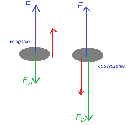 Dla obu sytuacji zapisujesz II zasadę dynamiki Newtona, z których wyznaczasz przyspieszenie. Porównując oba przyspieszenia ze sobą, możesz wyznaczyć wartość siły podnośnika. W zadaniu jest prośba o wyznaczenie masy. Jeśli podnośnik ma pracować ze stałą prędkością, to znaczy, że jego siła równoważy siłę grawitacji, dlatego uzyskaną siłę możesz podzielić przez przyspieszenie ziemskie, aby uzyskać masę.