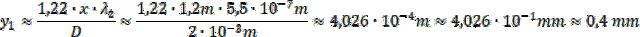 Ze wzoru na zdolność rozdzielczą przyrządów optycznych wyliczamy najmniejszą długość boku oczka siatki, dla której to oczko będzie widoczne dla światła żółtego.