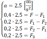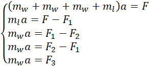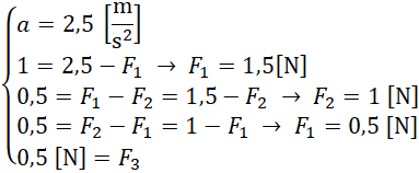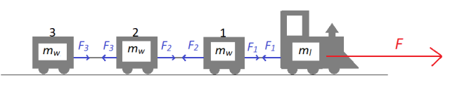 Na rysunku przedstawiono lokomotywę, która jest ciągnięta przez dziecko z siłą 2,5 N. Masa wagonika to 200 g, a masa lokomotywy to 400 g. Twoim zadaniem jest wyznaczyć naprężenia sznurka pomiędzy wagonikami 3 i 2, 2 i 1 oraz wagonikiem 1 a lokomotywą. Następnie porównaj te siły ze sobą.