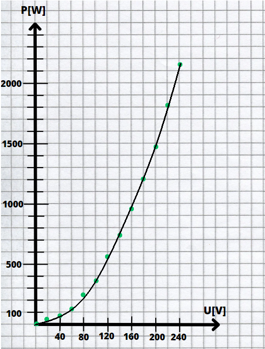 Policz dla każdego pomiaru moc czajnika i sporządź wykres zależności mocy od napięcia.