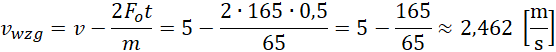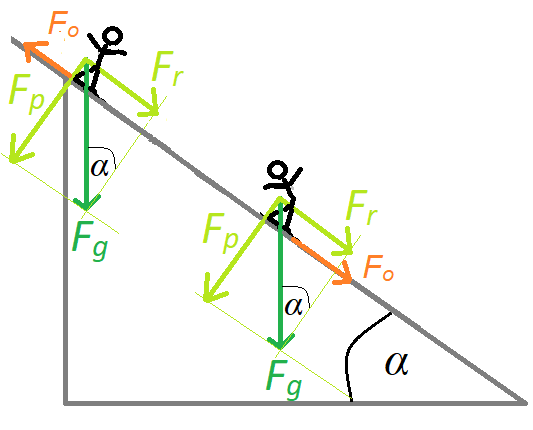 Narysuj sobie opisaną sytuację. Wyznacz wartości sił za pomocą funkcji trygonometrycznych. Na rysunku przedstawiono opisane siły. Napisz równanie II zasady dynamiki Newtona osobno dla pierwszego oraz drugiego rolkarza tak, aby wyznaczyć ich prędkość. Prędkość względna będzie sumą ich prędkości, ponieważ zbliżają się do siebie – wektory prędkości mają przeciwny zwrot.