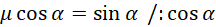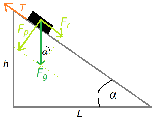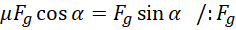 Narysuj sobie opisaną sytuację. Wyznacz wartości sił za pomocą funkcji trygonometrycznych. Na rysunku przedstawiono opisane siły. Ruch klocka był w przybliżeniu jednostajny, zatem siła tarcia musi być zrównoważona przez równoległą składową siły nacisku.