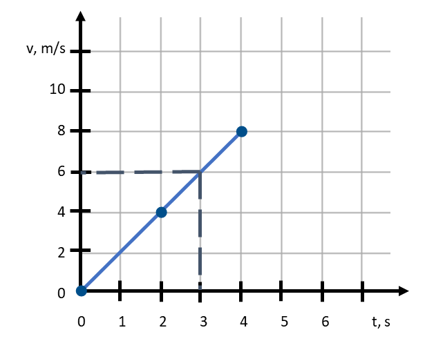 Poprowadź prostą od punktu t = 3 s do przecięcia z wykresem. Punkt przecięcia zrzutuj na oś v i odczytaj wartość szybkości na koniec 3 s ruchu.