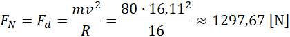 Narciarz wodny jest holowany przez łódź, która płynie z prędkością 58 i pokonuje zakręt o promieniu 16 m. Masa narciarza to 80 kg. Oblicz, jaka jest siła naciągu liny na zakręcie.