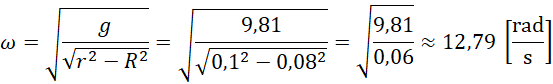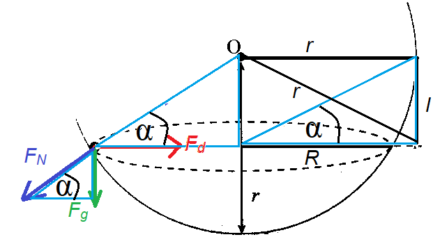 Narysuj sobie siły, jakie działają na kulkę i opisz je. Aby wyznaczyć przyspieszenie kątowe oraz siłę nacisku kulki na ściankę naczynia, skorzystaj z podobieństwa trójkątów, które przedstawiono na rysunku. Zależności pomiędzy siłami odpowiadają zależnościami pomiędzy długościami boków trójkąta.