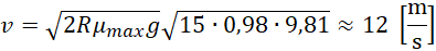 Rowerzysta wjeżdża w zakręt o promieniu 15 m. Współczynnik tarcia pomiędzy oponami a torem wynosi 0,98. W tym zadaniu Policz, jaką dopuszczalną prędkość może mieć rowerzysta na tym zakręcie.
