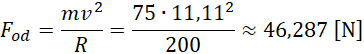 Policz, jaka jest wartość siły odśrodkowej, która działa na pasażera o masie 75 kg, jadącego w autobusie, który pokonuje zakręt o promieniu 200 m z prędkością