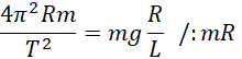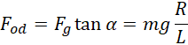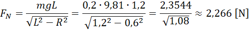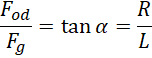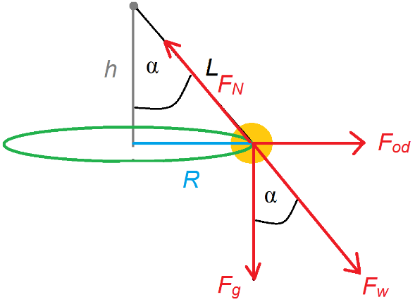 Aby wyznaczyć okres drgań wahadła, oblicz wartość siły odśrodkowej dwoma sposobami. Najpierw jako wzór klasyczny, w którym uwzględnisz okres drgania. Następnie porównaj ten wzór z wartością siły dośrodkowej, którą można wyznaczyć za pomocą funkcji trygonometrycznych tak, jak pokazano to na rysunku. Siła naciągu liny równoważy siłę odśrodkową i siłę ciężkości.