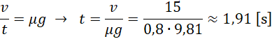 Pasażer pozostawił torbę na podłodze w autobusie, który po ruszeniu rozpędził się do prędkości 54 . Policz, jaki jest minimalny czas do osiągnięcia prędkości tak, aby torba nie przesuwała się po podłodze. Współczynnik tarcia to 0,8.