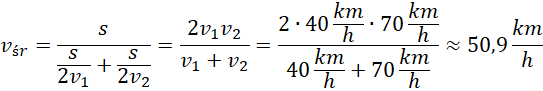 Prędkość średnią na całej trasie obliczamy, dzieląc całkowitą drogę przez cały czas trwania ruchu. Wartości czasu potrzebnego na przebycie obu odcinków trasy wyznaczamy za pomocą wzorów występujących w ruchu jednostajnym prostoliniowym. Wartości szybkości na poszczególnych etapach trasy odczytujemy z poprzednich podpunktów zadania.