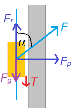 Zauważ, że używając siły skierowanej delikatnie do góry, dociska się cegłę do ściany, ale poruszać się będzie ona w górę. Jeśli osiąga przyspieszenie, to znaczy, że wypadkowa tej siły to równoległa składowa pomniejszona o siłę grawitacji oraz o siłę tarcia.
