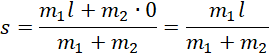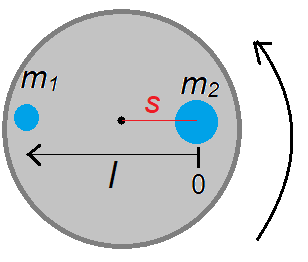 Tarcza kręci się jednostajnie z określoną częstotliwością, czyli jej prędkość jest stała. Oznacza to, że działające na tarczę siły się równoważą. Wynika z tego, że środek masy całego układu znajduje się w środku tarczy. Wyznacz, jaka jest odległość większej kulki od tego środka, zatem najwygodniej będzie, jeśli przyjmiesz, że układ współrzędnych rozpoczyna się w środku większej kulki i skierowany jest w stronę mniejszej kulki, przechodząc przez środek tarczy. Następnie wykorzystujesz wzór na środek masy układu.