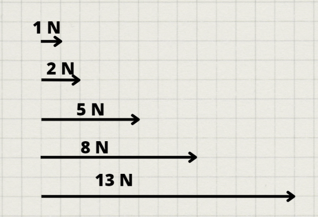 Narysuj w zeszycie siły o wartościach: 2 N, 5 N, 8 N, 13 N o kierunku poziomym i zwrocie w prawo, jeżeli 1 N odpowiada wektor o długości 0,5 cm.