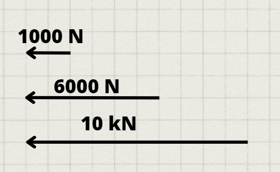 Narysuj siłę o wartości 6000 N i 10 kN o kierunku poziomym i zwrocie w lewo, jeżeli 1 cm odpowiada 1000 N.