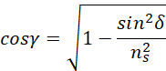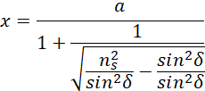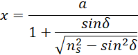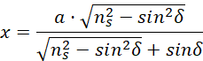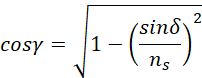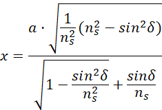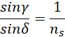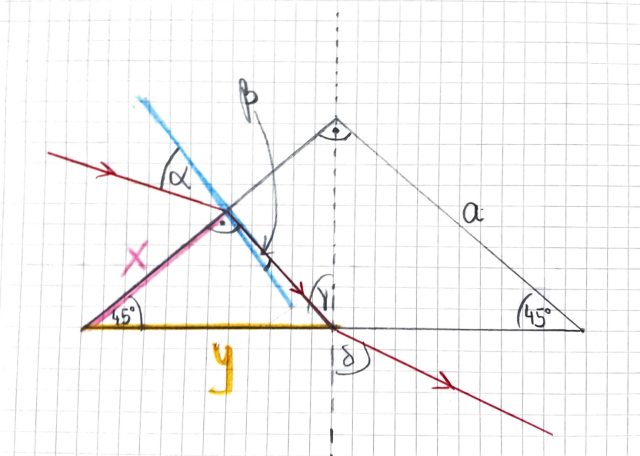 Następnie narysuj odpowiedni rysunek, który uwzględnia prawidłowe założenia. Dalej, korzystając z prawa Snella oraz sinusa kąta padania na dłuższą przeciwprostokątną, wyprowadź następującą zależność: