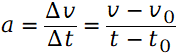 Przyspieszenie to stosunek zmian szybkości do czasu ruchu. Niech v to szybkość końcowa, v0 to szybkość początkowa, t to czas zakończenia ruchu (lub pomiaru), zaś t0 to początek ruchu (lub pomiaru):