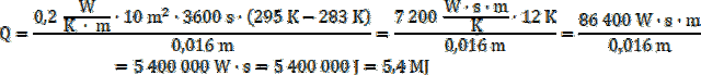 , wiedząc, że ma ona powierzchnię równą 10 m2 i grubość 1,6 cm. Przyjmij, że temperatury po obu stronach wynoszą odpowiednio 10°C i 22°C, a cały proces trwa godzinę.
